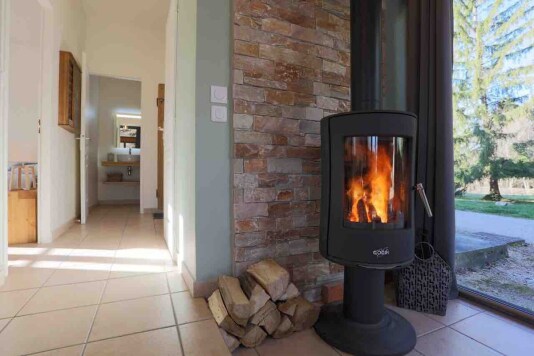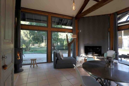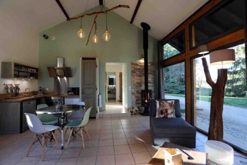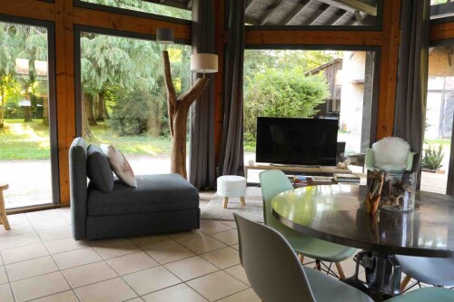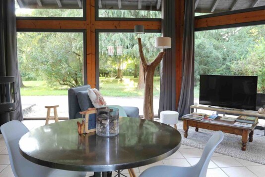 Le séjour spacieux et entièrement vitré (à l’exception des chambres) vous offre une vue splendide sur le parc du château. Vous pourrez profiter d’un cadre lumineux et apaisant. Le poêle à cheminée (bois mis à disposition) ajoute une touche de confort supplémentaire, créant une ambiance chaleureuse et cosy, idéale pour se détendre après une journée pleine d'aventures. Les trois chauffeuses convertibles offrent un couchage supplémentaire si nécessaire, et la TV écran plat complète cet espace moderne et accueillant.
